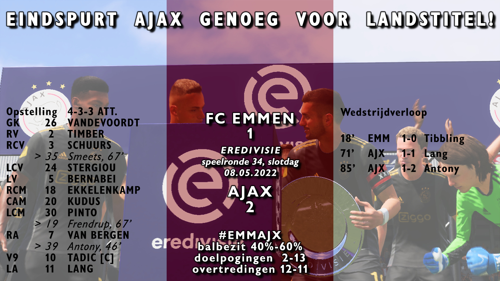 Op het nippertje heeft Ajax een zege weggesleept bij Emmen en daarmee het kampioenschap!