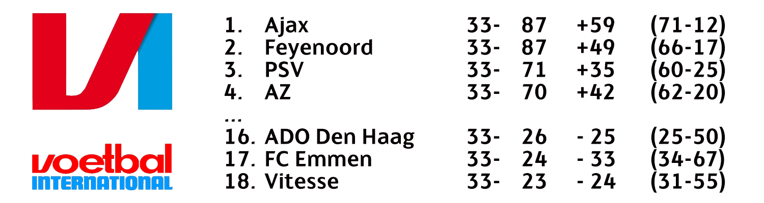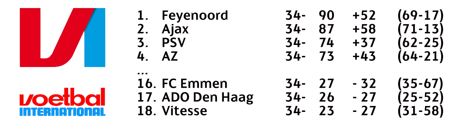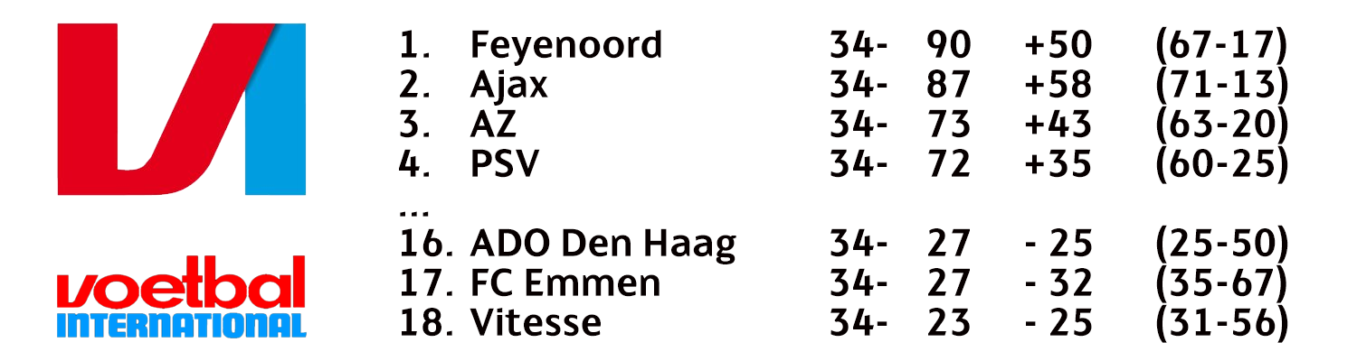 Feyenoord ligt op koers voor het kampioenschap, Vitesse is op weg naar de Eerste Divisie.