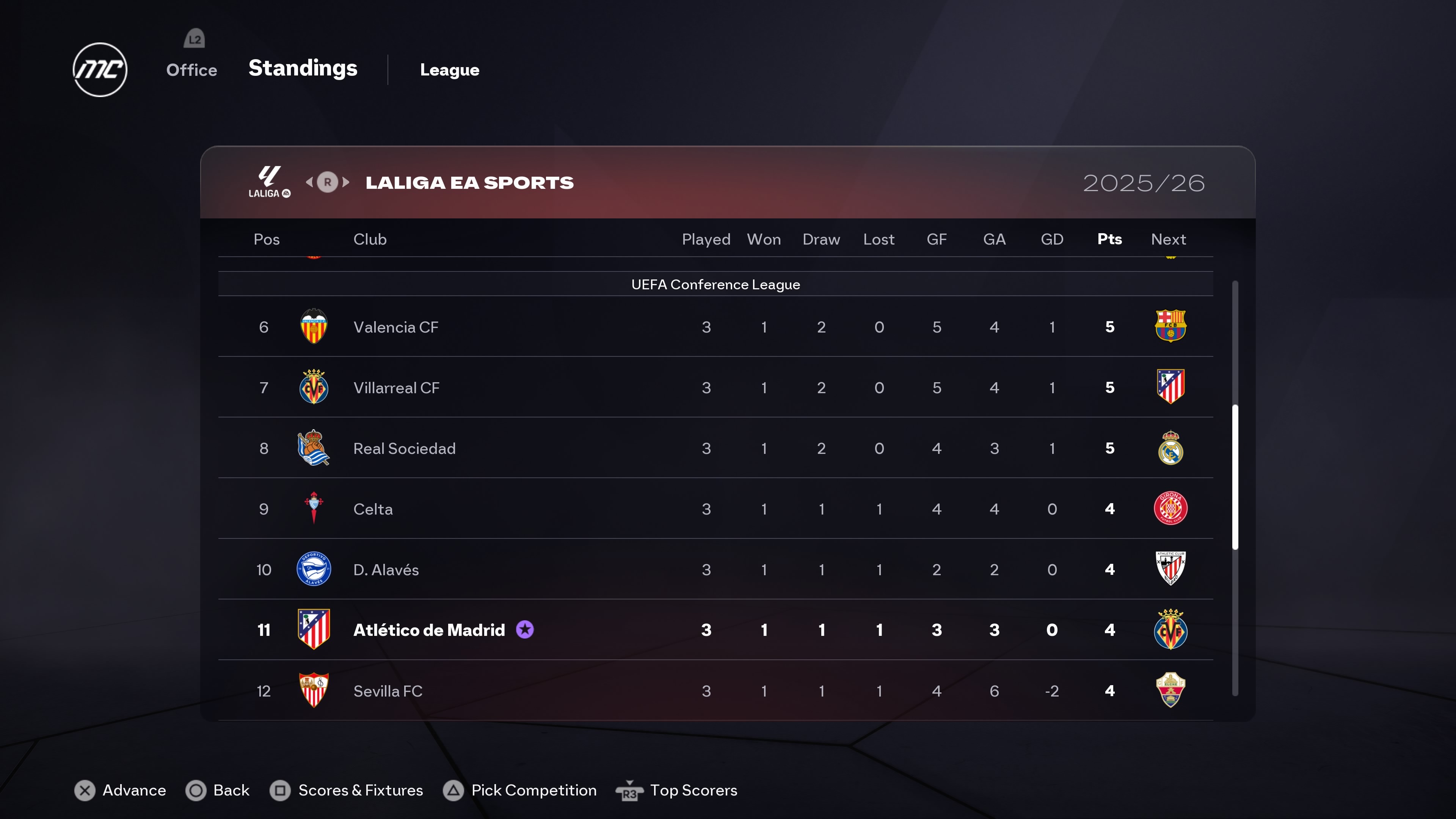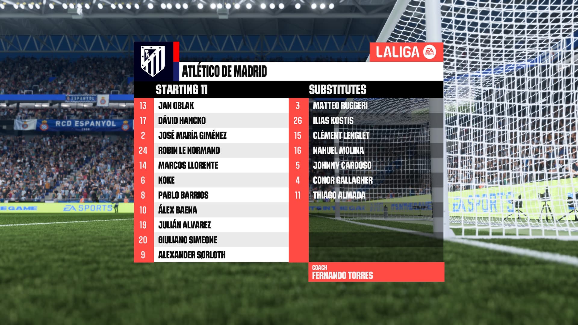 Aanwinsten Hancko & Baena startten samen op de linkerflank, terwijl het spitsenduo bestond uit Alvarez & Sørloth. Op weg naar de dugout begroette Torres hartelijk collega Manolo González, klaar voor zijn allereerste officiële wedstrijd als hoofdtrainer van Atlético Madrid.
