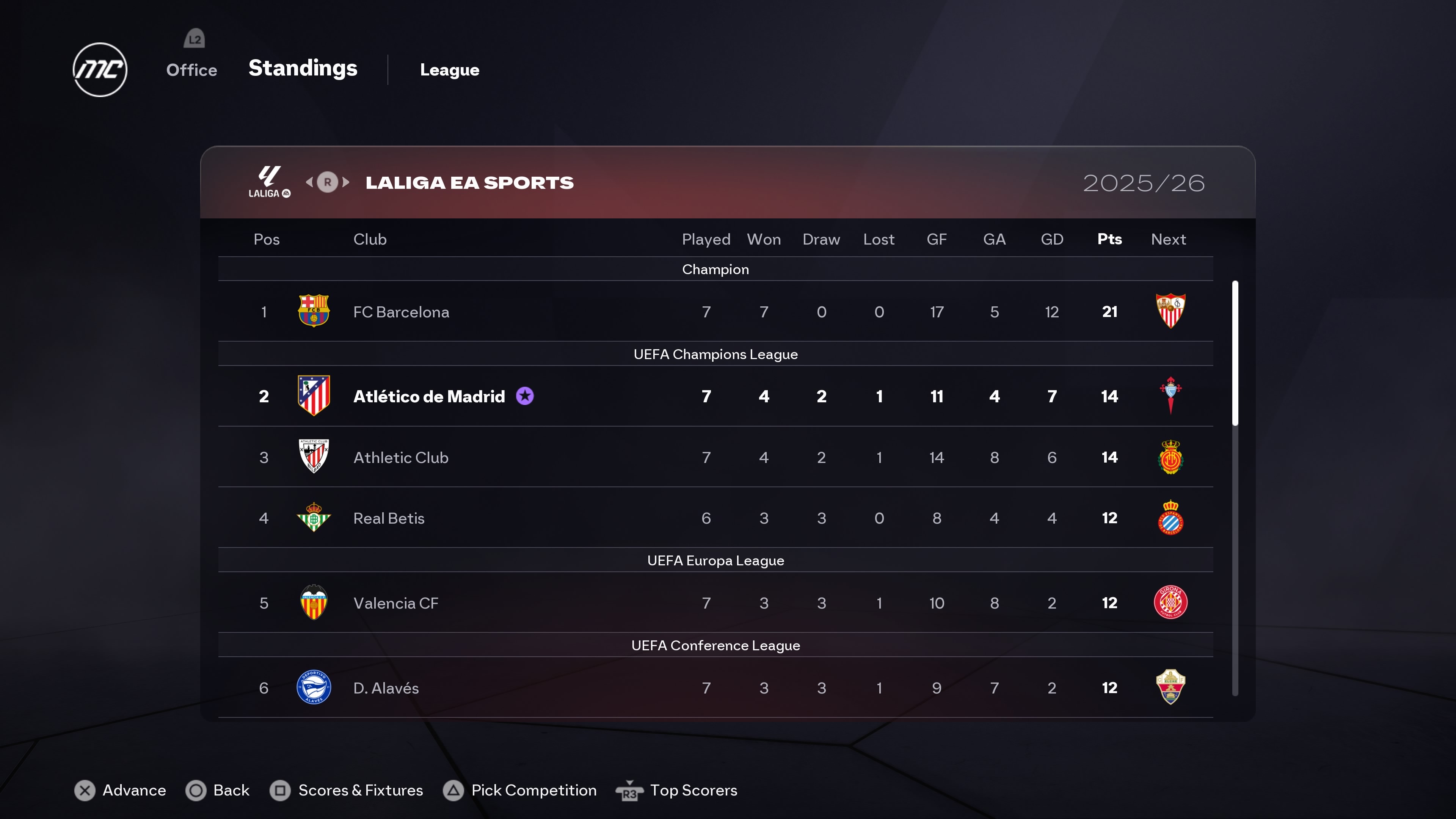 Overigens een viermansdefensie met Ruggeri, Lenglet, Giménez & Molina. In het middenveld kwamen Koke & Gallagher terug in de basis. Ook Nico, Baena & Guiliano startten met Sørloth in de punt van de aanval. Griezmann begon daardoor op de bank, Julian Alvarez zat niet in de selectie, hij werd rust gegund voor dit duel.