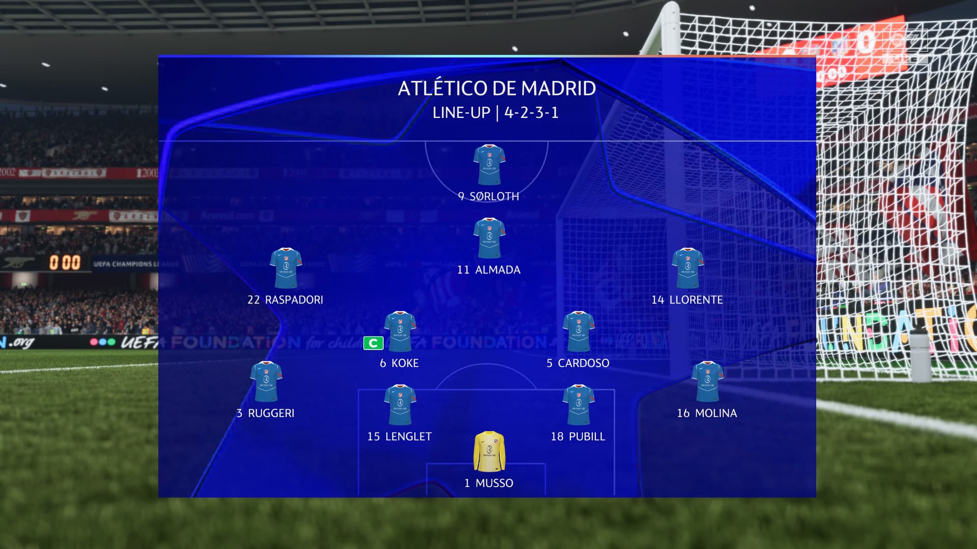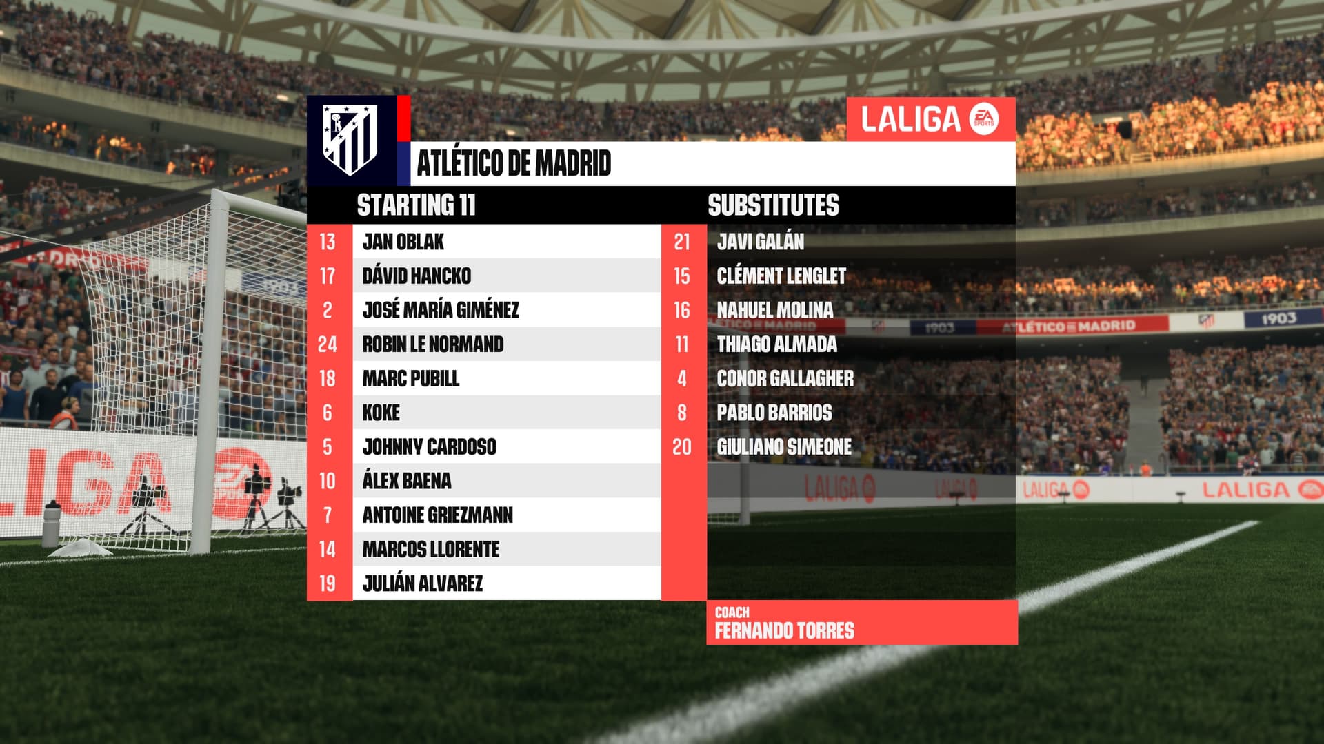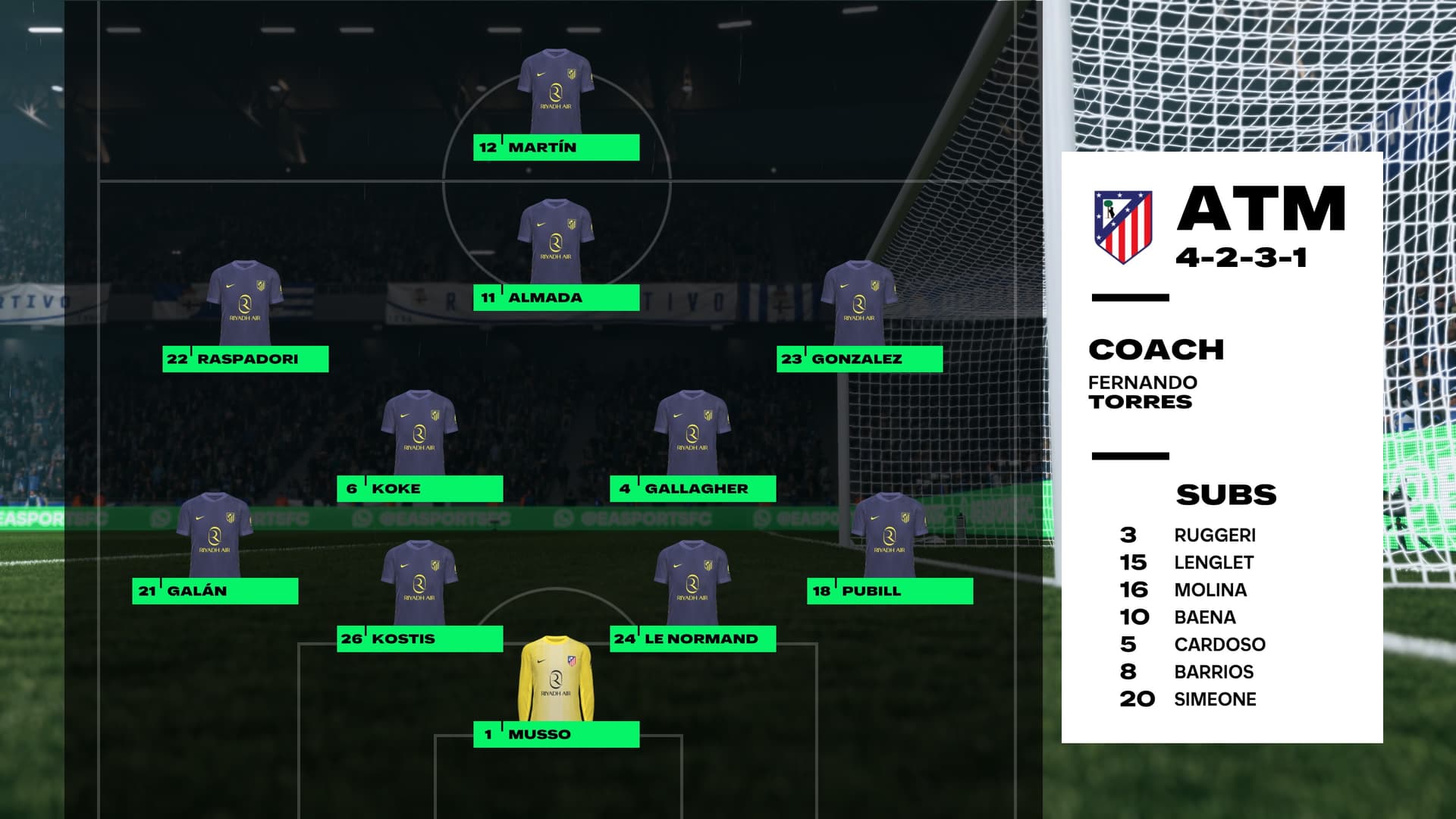 Fernando Torres voerde, met de interlandbreak in gedachten, enkele wijzigingen door: Ruggeri startte op de linksachter, waardoor Hancko centraal de plaats in nam van een niet fitte Giménez. Centraal op het middenveld stond het duo Koke – Gallagher, de positie achter de aanvaller was weggelegd voor Almada, die zijn eerste basisplaats kreeg ten nadele van Griezmann. De overige namen waren geen verrassingen.