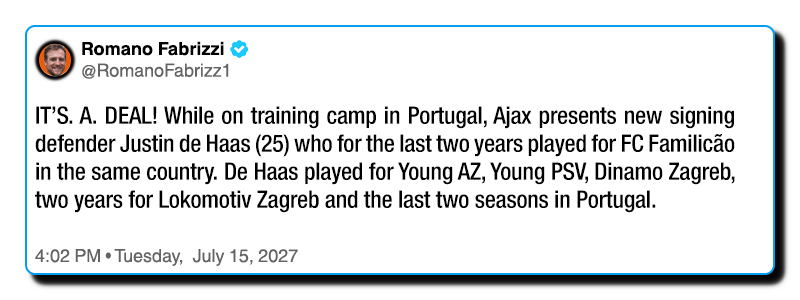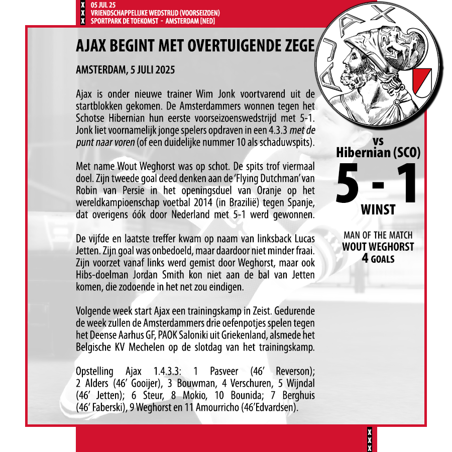 Voor de korte termijn is dat het: Lengte en Voetbal van achteruit. Nou, De Haas is duidelijk gehaald voor lengte en zijn fysiek. Ik denk nog aan een keeper, een linksback en een controleur als aanvullingen. Voor de rest is het afhankelijk van wat er gaat vertrekken (ik reken erop dat Hato, Brobbey, Henderson, Traoré, mogelijk Sutalo en Taylor zullen verkassen), maar ik verwacht nog een flinke en ingrijpende renovatie over de komende drie transferperioden. Alleen, dus niet via parate aankopen, maar meer spelers, die pas over een twee seizoenen samen met wat jeugdspelers kunnen doorbreken: vandaar dat we niet alles meteen in de uitverkoop willen doen, dat zou ons danig verzwakken.