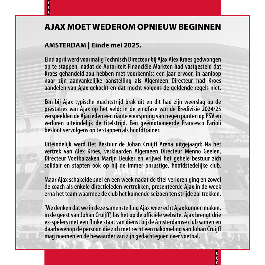Ajax heeft weer een bestuur en een nieuwe trainer: oude bekenden keren terug in de Arena. Het doel is om de terug te gaan naar de tijd van de ‘fluwelen revolutie’ van wijlen Johan Cruijff, met het verschil dat deze keer vastgehouden wordt aan deze lijn, omdat nu de schrijvers van ‘Plan Cruijff’ en beheerders van het gedachtegoed van Johan Cruijff zelf de lakens gaan uitdelen bij Ajax.