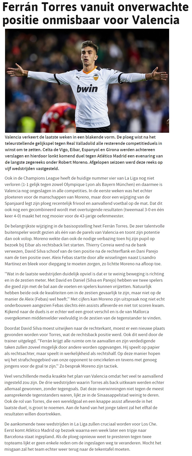 Kijkend naar de resultaten doet Moreno het in elk geval niet slecht, kan lastig oordelen hoe de jonge spelers het doen in je elftal maar dat bijvoorbeeld Leite een basisplaats heeft zegt wel wat denk ik. Wat betreft Soler, tsja dat is wel een beetje het risico als je David Silva terug haalt. En wie moet je er uithalen? Dan kom je toch al snel bij Torres, Guedes of Parejo uit en dat lijken mij ook prima spelers.